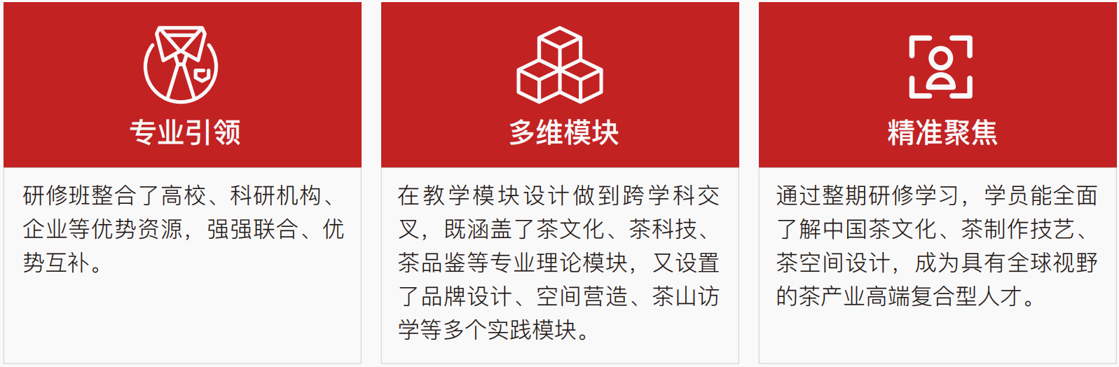 本项目依托浙江大学多学科的专业师资和人才培养体系,系统梳理和传授茶文化、茶科技、茶艺、茶品牌与空间营造知识;结合行业特色,配套相关理论课程和实践教学。希望搭建茶界互联平台,建设茶行业互联智库,提高人们的茶道美学鉴赏和空间设计水平。