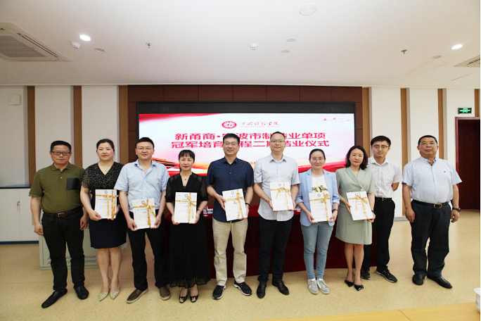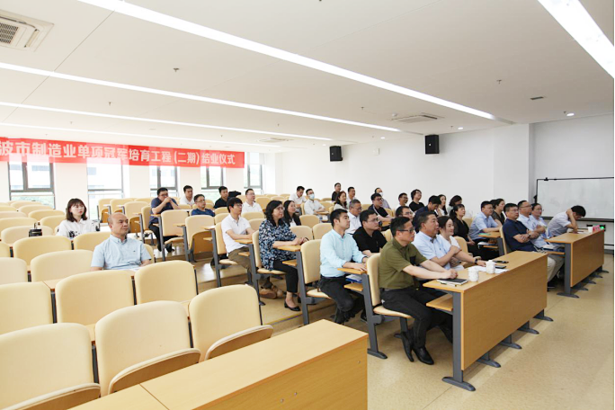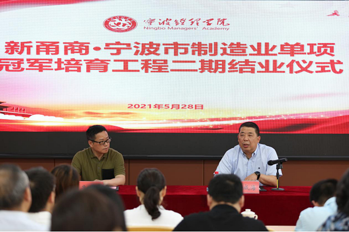 5月28日,新甬商·宁波市制造业单项冠军培育工程(二期)在宁波经理学院举行。浙大宁波理工学院副校长鲁东明,宁波市经济和信息化局党组成员、二级巡视员陈成海及六十多名共同参加了此次结业仪式,结业仪式由宁波经理学院项目一部主任陈莉莉主持。