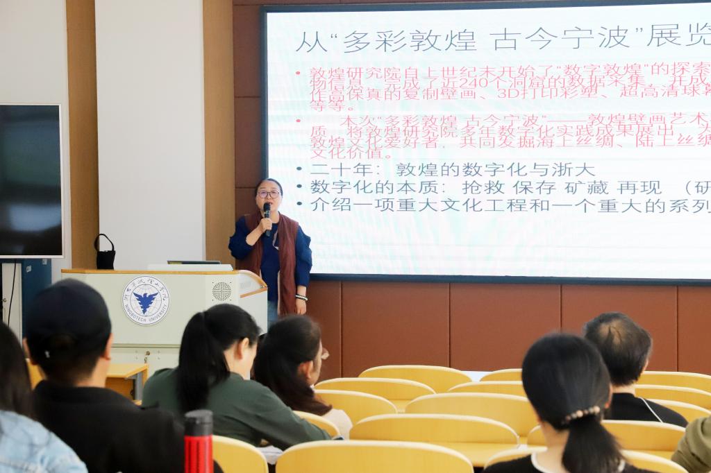 在“多彩敦煌 古今宁波”敦煌壁画艺术精品高校公益巡展开展期间,10月13日,由宁波市教育局支持的敦煌文化传承与教师人文艺术素养提升培训班在浙大宁波理工学院继续教育学院圆满结束,来自宁波市中小学的46名教师参加了本次培训。此次培训师资及专家得到了中国敦煌石窟保护研究基金会、浙江大学艺术与考古学院、浙江大学遗产文化研究院等单位的大力支持。