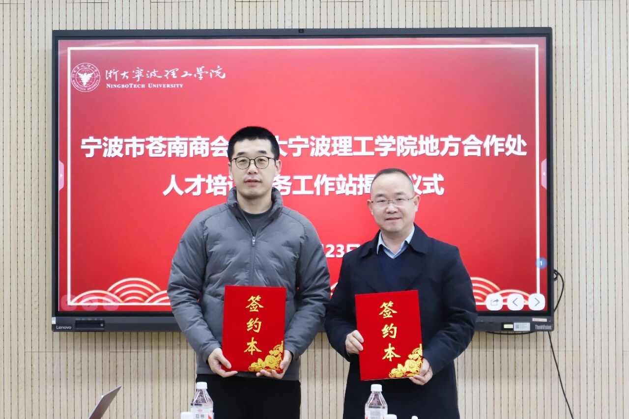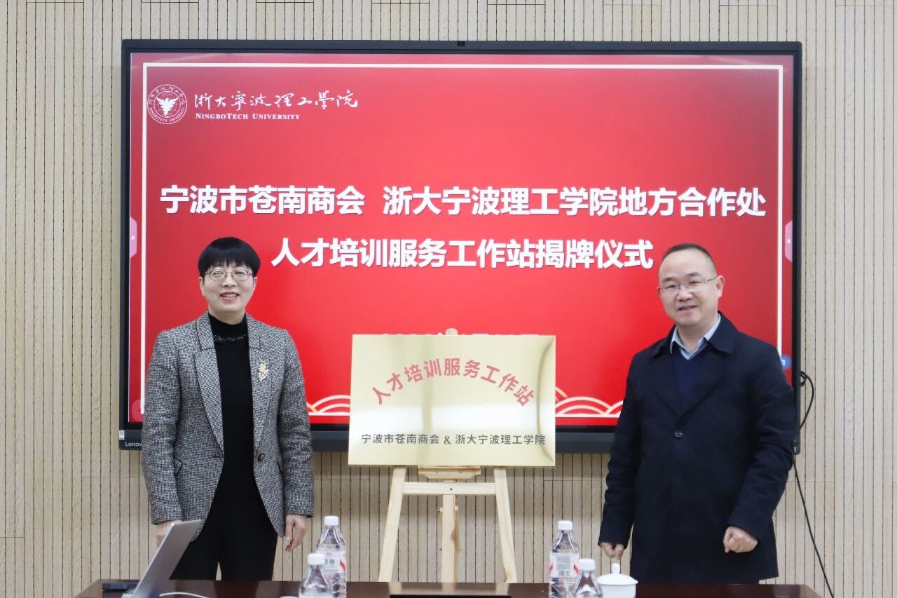 吴春与戴安东为宁波市苍南商会-浙大宁波理工学院人才培训服务工作站揭牌。